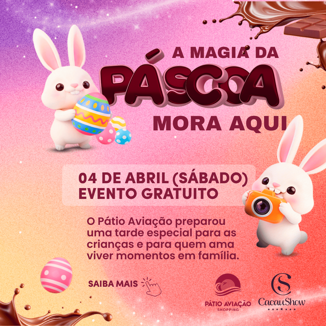 O Pátio Aviação preparou um evento especial para celebrar a Páscoa com muita alegria, diversão e momentos inesquecíveis em família!